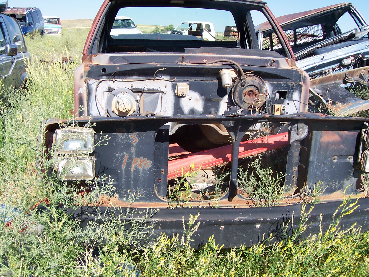 The front of a 79 macho in a junkyard. note the black engine compartment and front of radiator support with grease pen markings including the macho paint procedure code PX9.